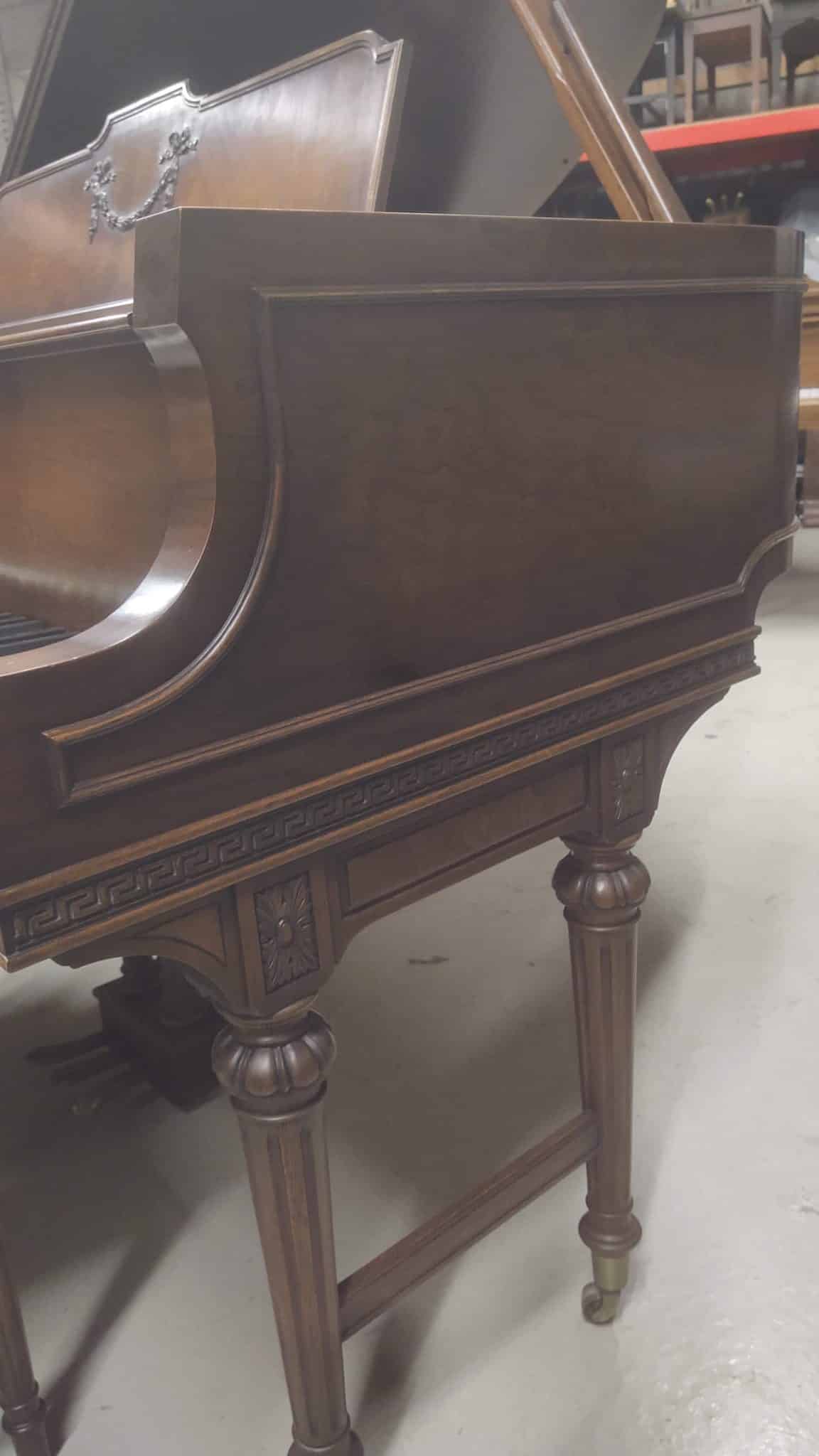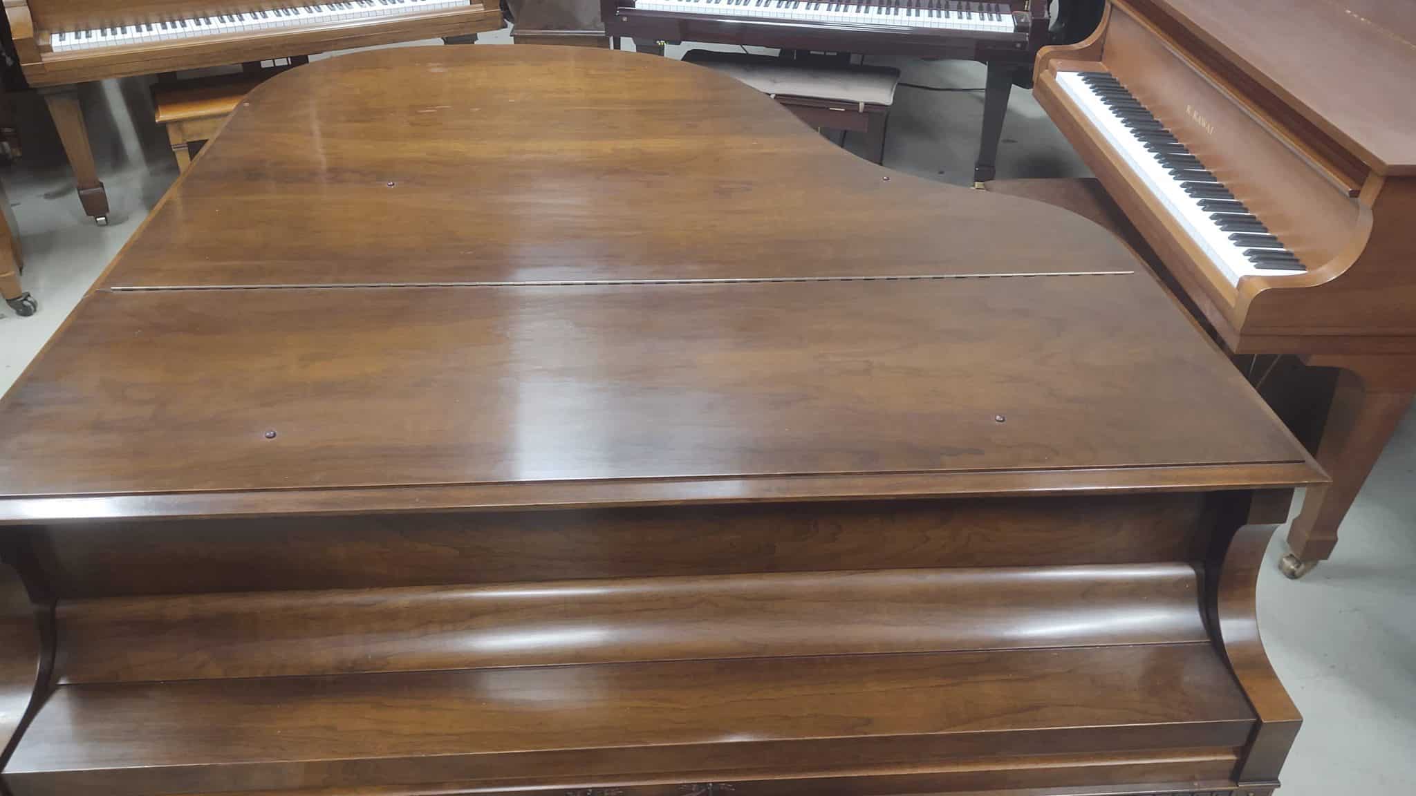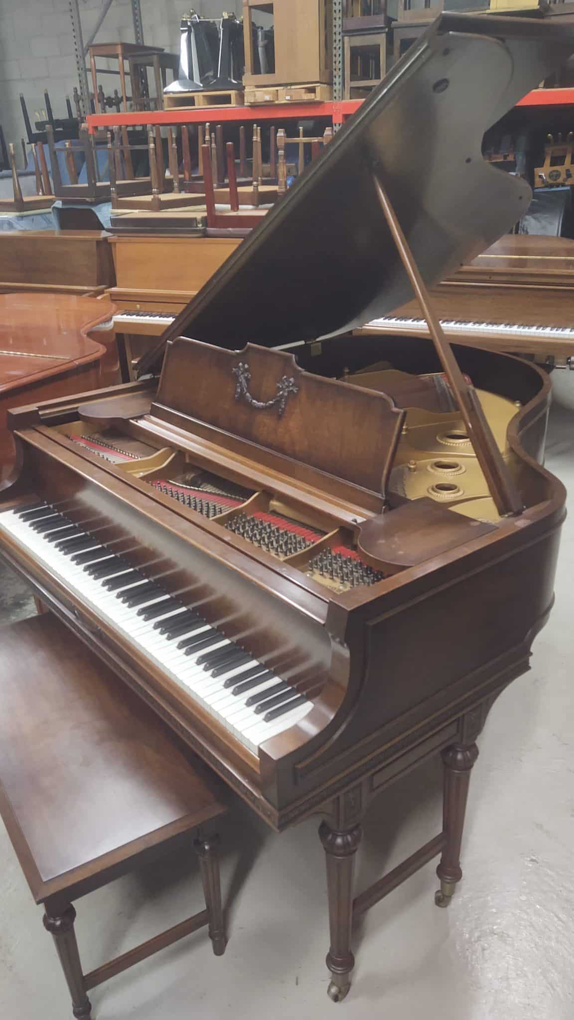 Baldwin baby grand piano. Magnificent carved walnut cabinet with matching bench, 5’5″ in length. Overall an excellent condition for its age. Plays and sounds well. Perfect Ivory keyboard. Asking $5,500.