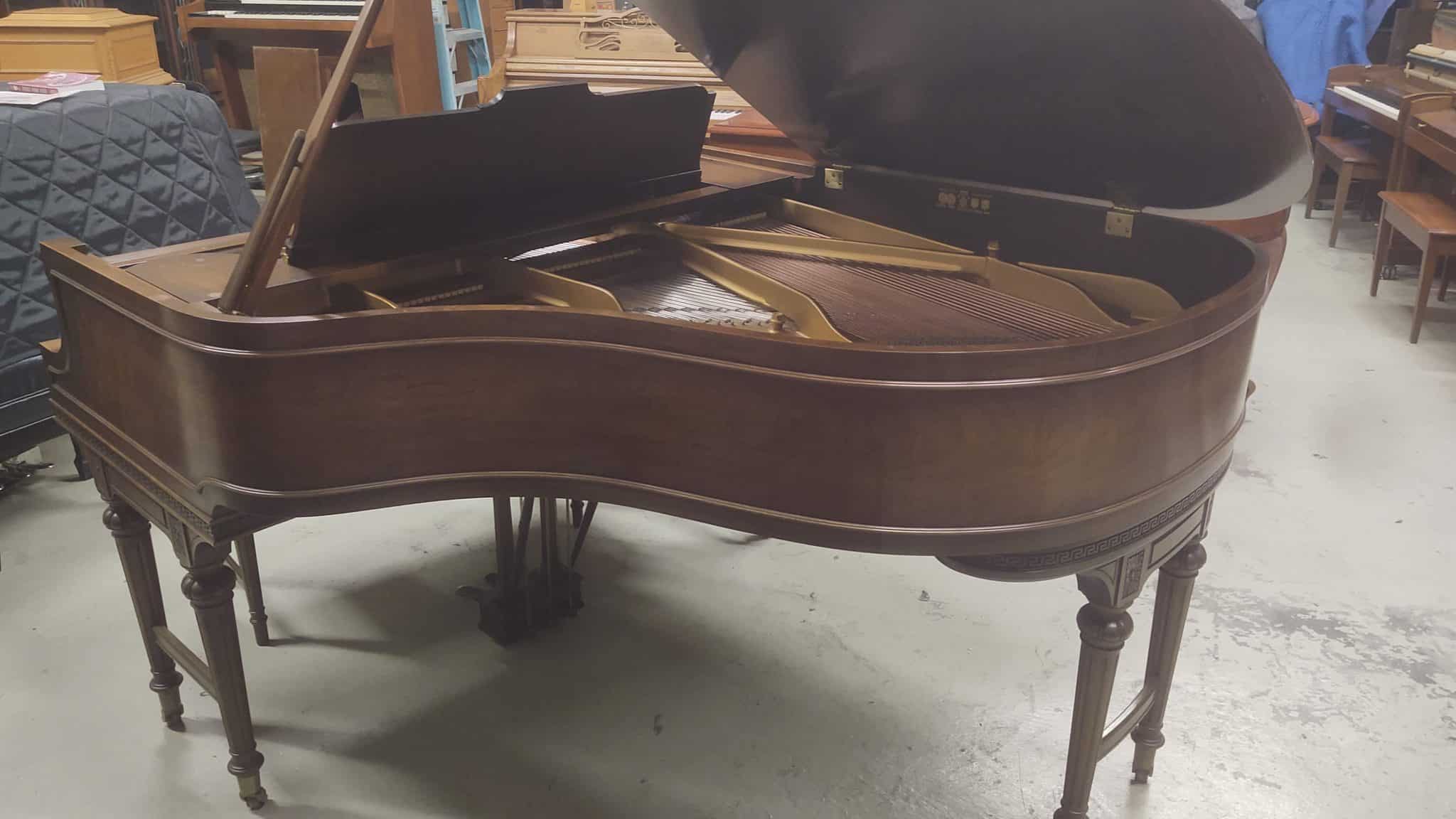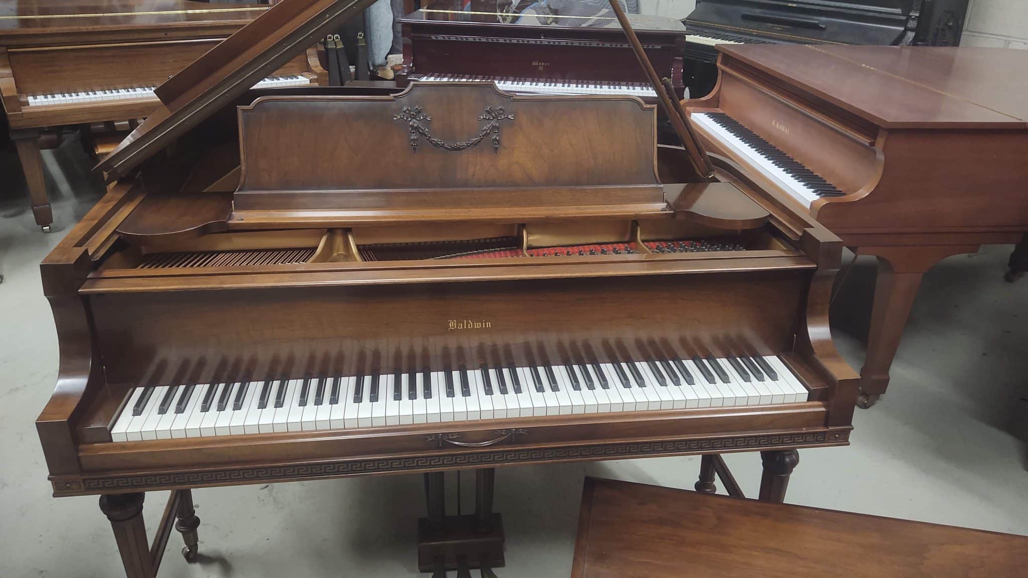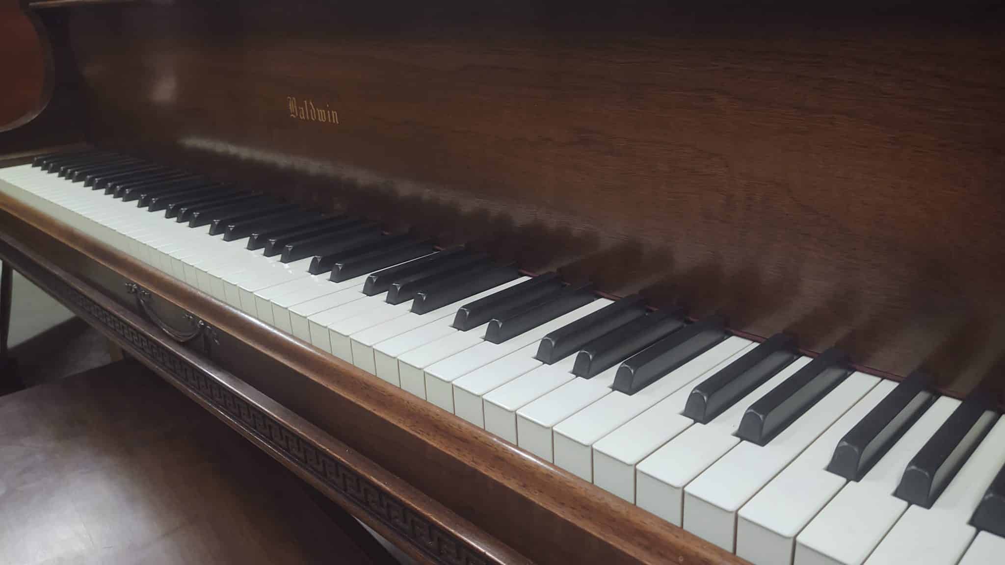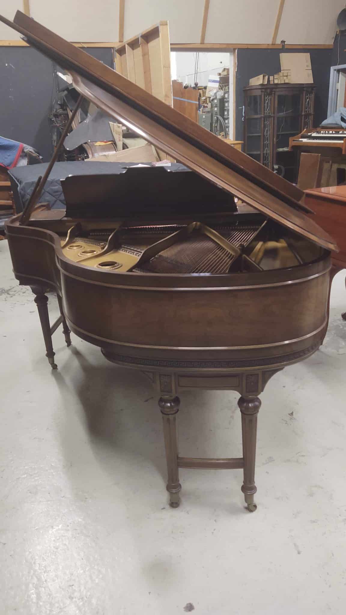 Baldwin baby grand piano. Magnificent carved walnut cabinet with matching bench, 5’5″ in length. Overall an excellent condition for its age. Plays and sounds well. Perfect Ivory keyboard. Asking $5,500.